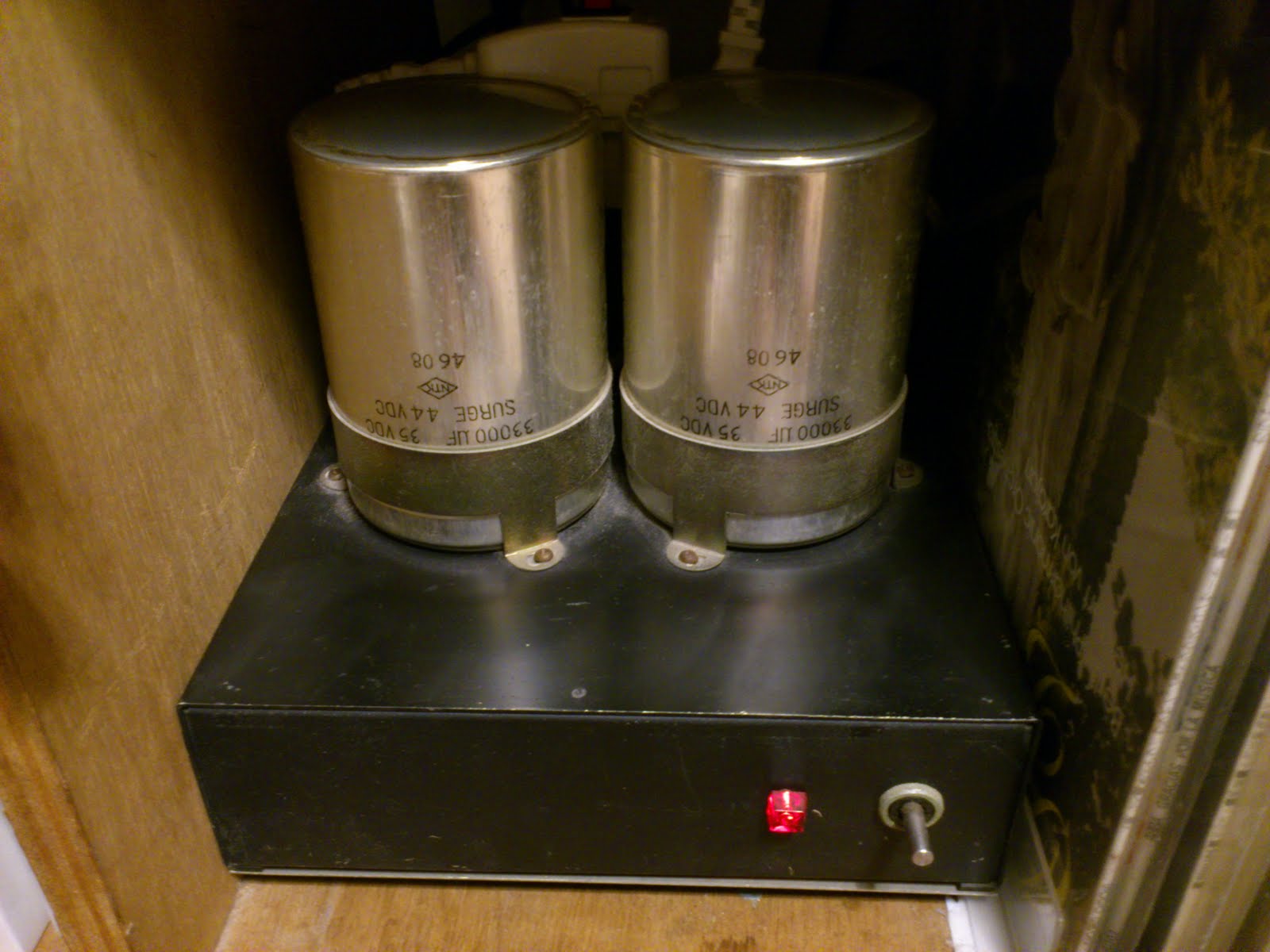 良く見てみると何の変哲も無い配線ですが、電源コンデンサーが当時では珍しい33000uF(工業用)の大容量を使用しているのでラッシュ電源を防ぐためのアブソーブ抵抗(コンデンサーや整流ダイオードのダメージを防ぐ)を施していたり、整流ダイオードのスイッチングノイズを吸収する、コンデンサーと抵抗が見られます。このような一寸した気配りがこの子達の長生きに継っているのです